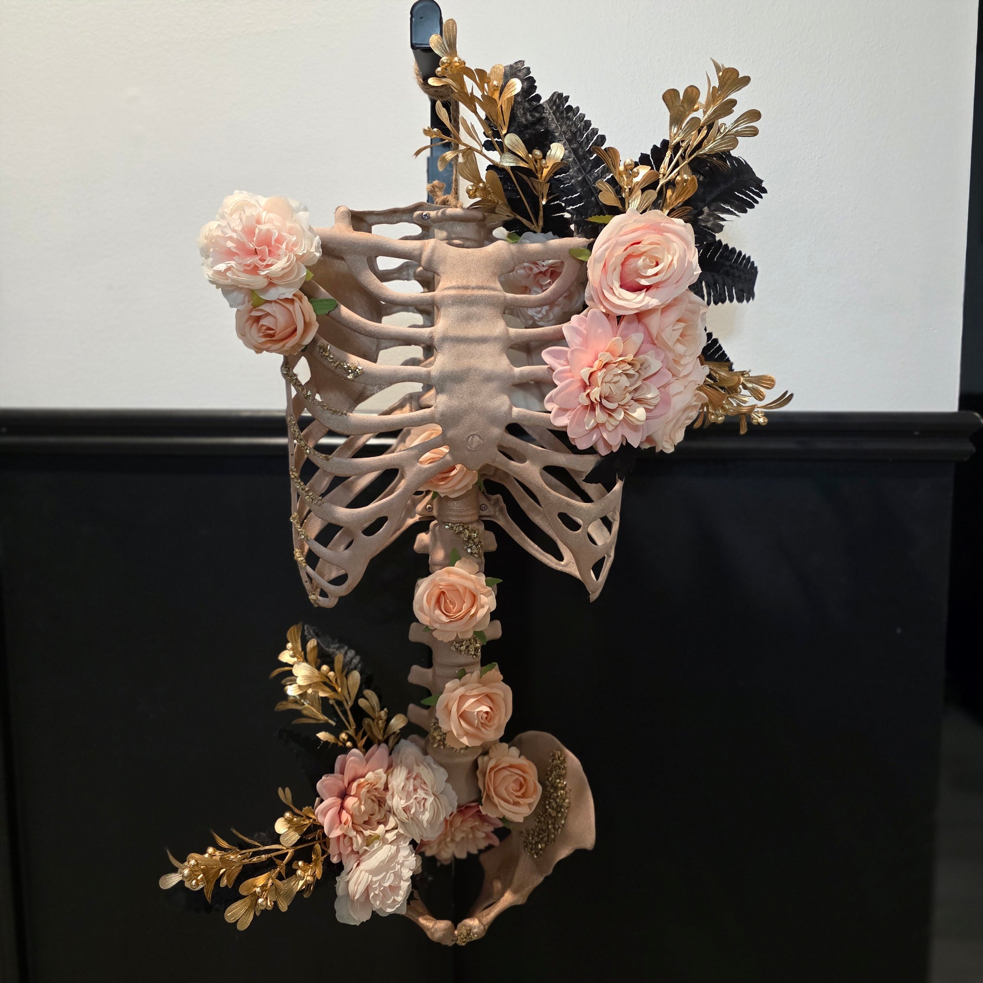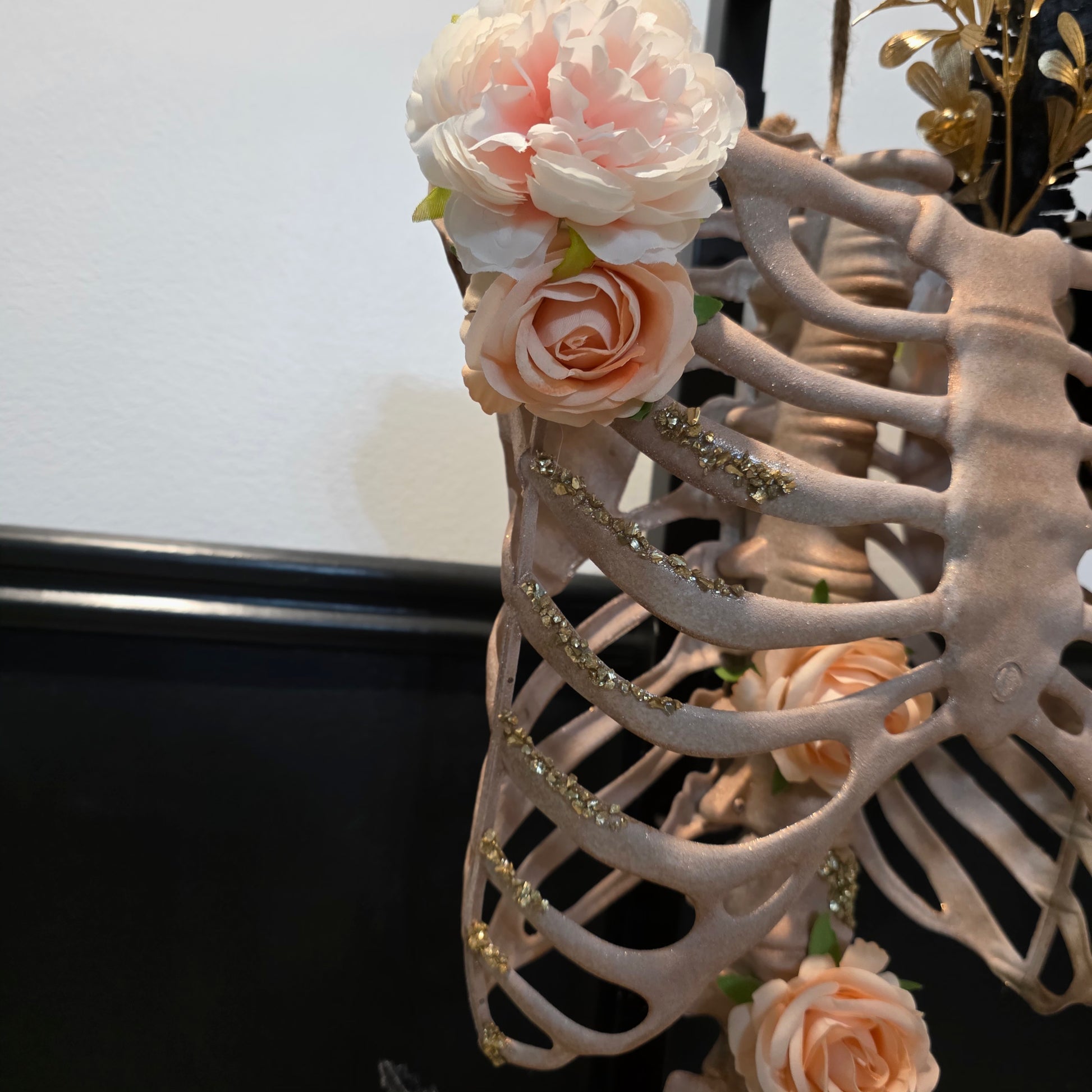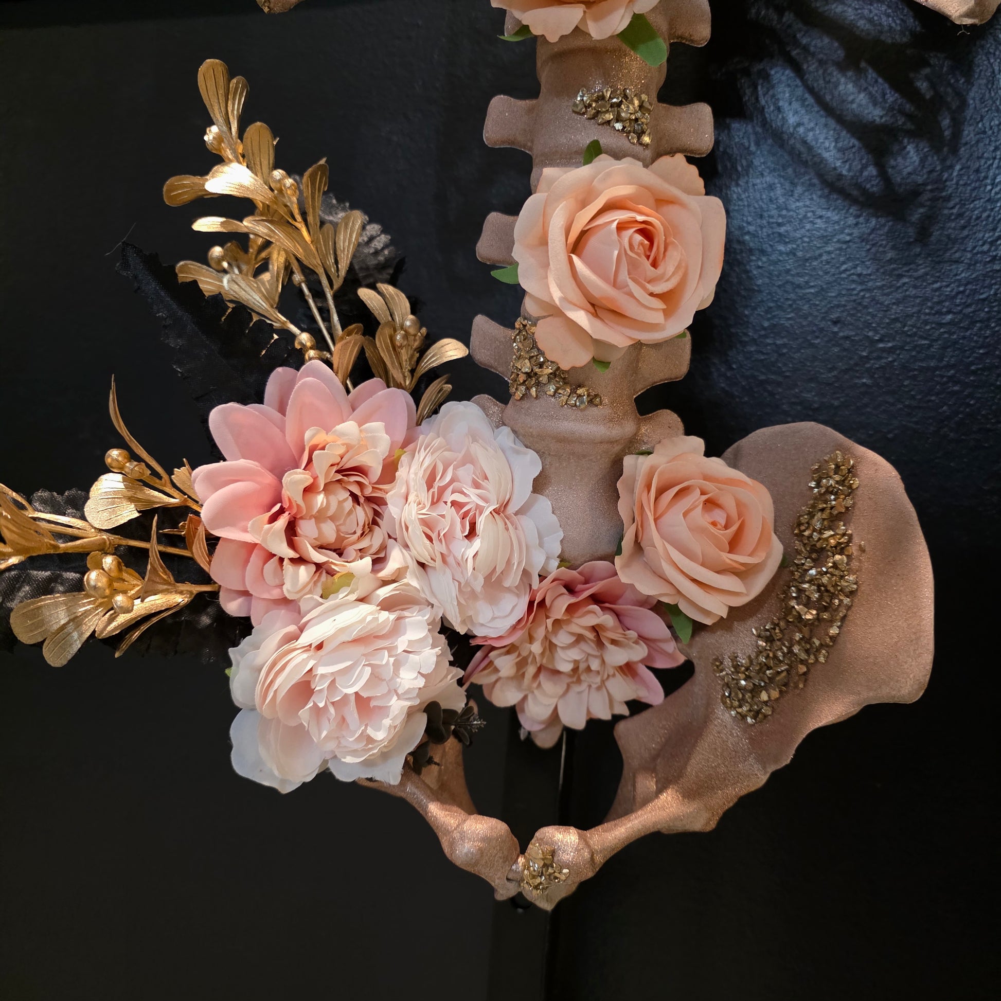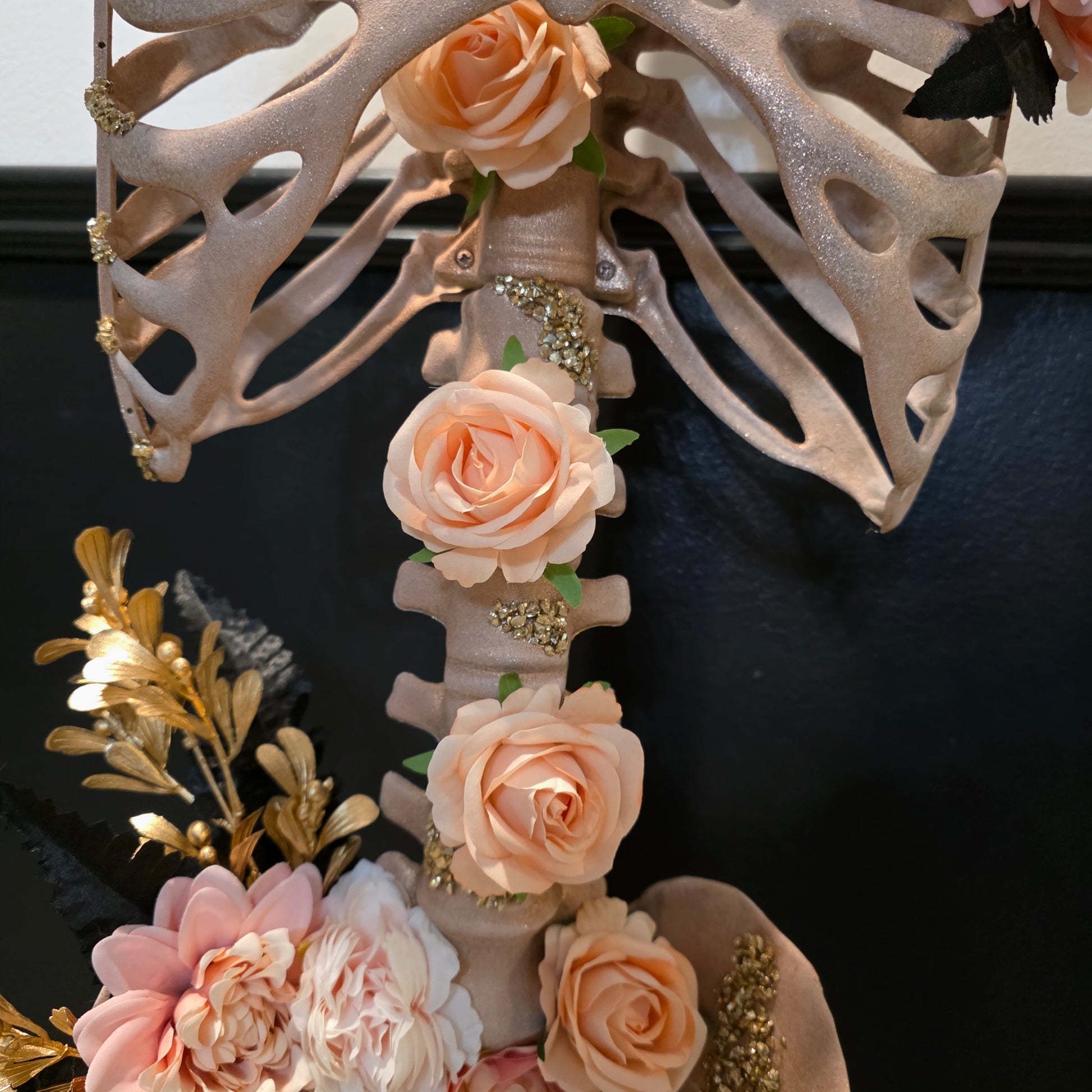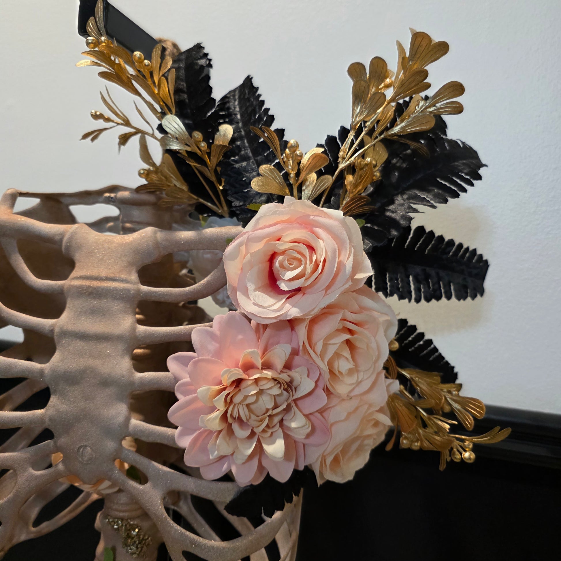Meet The Princess—where glamour gets a glittery upgrade. This rose gold beauty features a sparkling torso crowned with dreamy peach and light pink flowers. Gold and black leaves add just the right amount of drama and depth, while enchanting gold glass details make the whole thing shimmer and shine like magic. Regal, radiant, and ready to adorn your home.